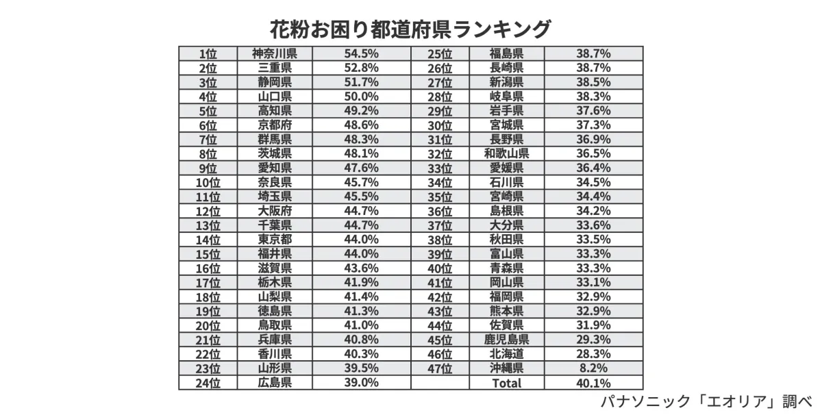 最近の調査に基づくと、最も花粉に悩まされている都道府県は神奈川県でおよそ54.5%が「困っている」と答えました。続いて三重県(52.8%)、静岡県(51.7%)が上位を占めています。一方、北海道(28.3%)や沖縄県(8.2%)は花粉の悩みが少ない地域として最下位となっています。このことから、多くの地域で花粉症が生活の質に影響を及ぼしていることが浮き彫りになります。