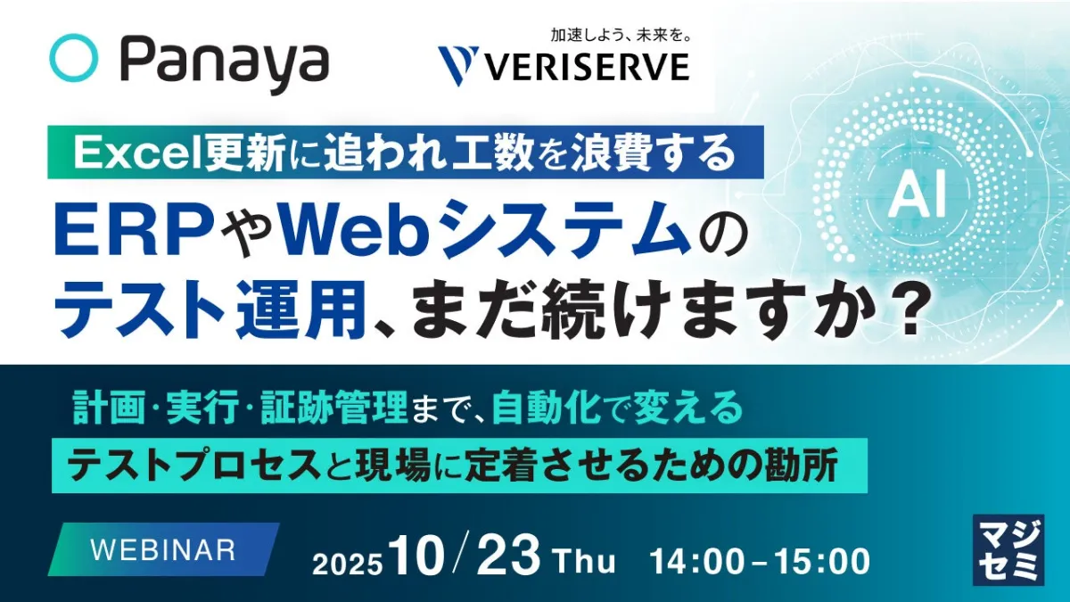 このウェビナーでは、Panaya社が提供するテスト自動化のソリューションを紹介し、Excel依存からの脱却と業務効率化を実現する具体的な方法を共有します。さらに、40年以上にわたる経験を持つベリサーブが、テスト業務の効率化を実現するための重要な視点と手法を解説します。主にテストプロセスの見直し、テスト自動化の導入、手動テストの効率化についてのポイントをお伝えし、実際の事例を交えて、現場での活用方法を示唆します。