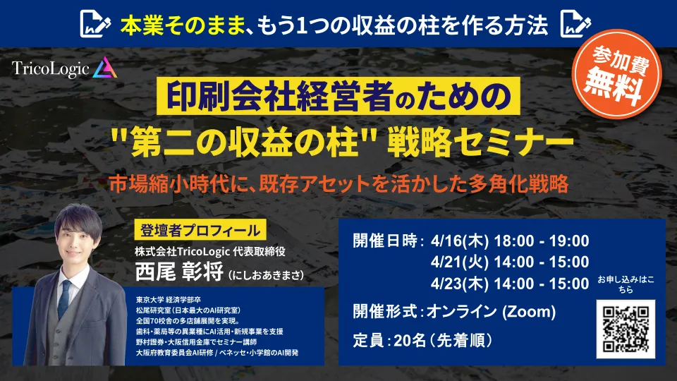2026年4月、東京大学発のAI企業である株式会社TricoLogicが開催するオンラインセミナーが注目を集めています。本セミナーは、印刷会社の経営者を対象に、AIの効果的な活用法や新規事業への展開について、具体的なデータや実績を交えながら解説することを目的としています。