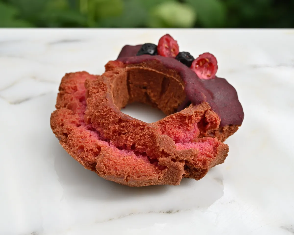 ロースオイルを練り込んだ生地にクリームチーズをサンドした、特別感溢れるドーナツ。紀尾井町ローズ祭りに合わせた華やかな逸品です。