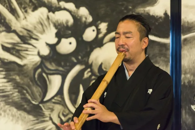 工藤煉山氏は、東京芸術大学大学院音楽研究科を修了し、宮内庁での御前演奏を経験。ヨーロッパでも演奏活動を行い、オーケストラや和太鼓との共演、さらにはBBCでの出演も果たしています。帰国後も全国各地で演奏活動を行い、古典的な尺八の魅力を現代に伝えるイベントを数多く企画しています。鎌倉を拠点に、自身の心と身体に向き合う企画「呼吸と尺八」を通じて、現代人のストレスを軽減する活動に取り組んでいます。
