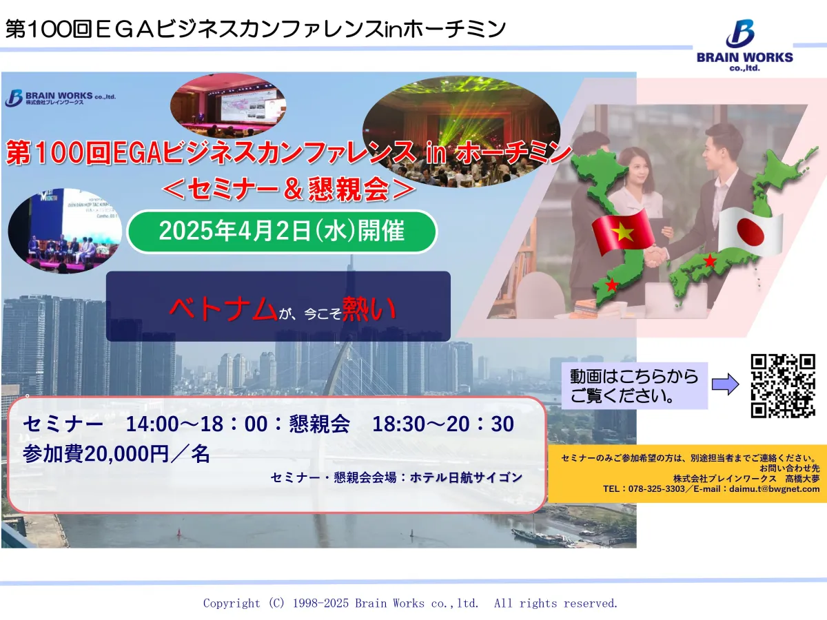 翌日4月2日には、ホテル日航サイゴンでの懇親会も仮予約されており、様々な分野の専門家による基調講演やビジネスセッションが進行予定です。特に、AIロボットビジネスについての紹介が行われるほか、環境問題への取り組みも議論される見込みです。
