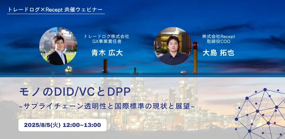 2025年8月5日(火)、デジタル技術が急速に進展する中での「モノのDID/VC」とDPP(デジタル商品プロフィール)をテーマにしたウェビナーを開催します。本ウェビナーは、株式会社Receptとトレードログ株式会社の共同主催にて予定されています。