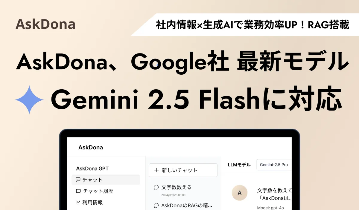 法人向け生成AIプラットフォーム「AskDona」を展開する株式会社GFLOPSは、同サービスのGPTチャット機能において、Googleが最新に開発したモデル「Gemini 2.5 Flash」への対応を発表しました。この新機能により、企業ユーザーはより高精度かつ迅速な回答を得ることが可能になり、業務の効率化が期待されます。