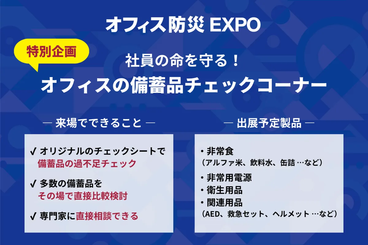 特別企画「オフィスの備蓄品チェックコーナー」は、企業が直面する防災の課題を解決し、実効性ある備蓄品管理をサポートすることを目的としています。安全な職場環境を整えるために、私たちと一緒に行動しましょう!