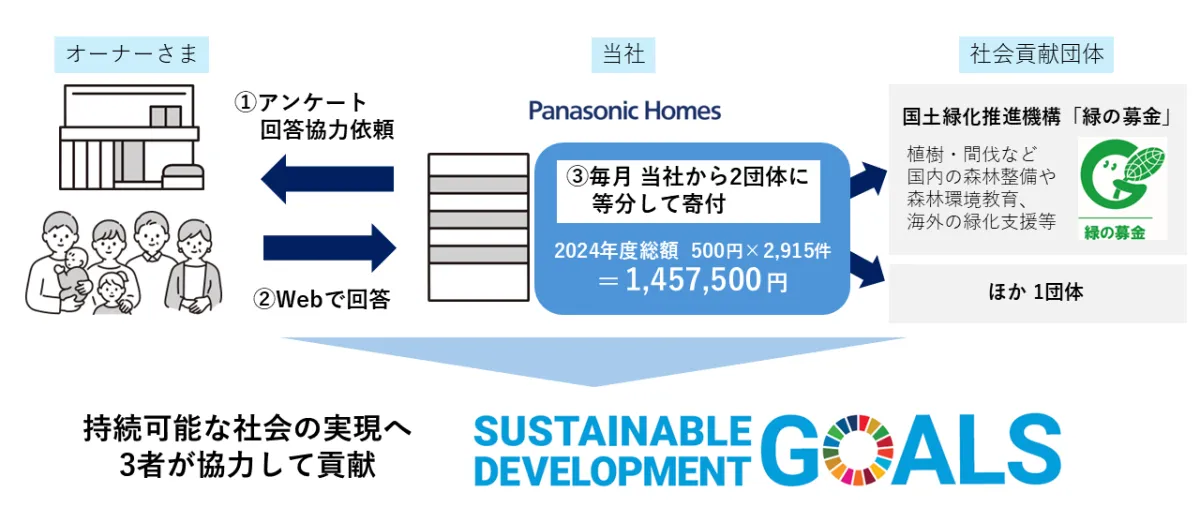 パナソニック ホームズ株式会社は、2024年度に実施した「お客さまアンケート」を通じて、社会貢献活動に力を入れています。この取り組みは、戸建住宅のオーナーからのアンケート回答件数に応じて、社会貢献団体に寄付をする形で行われています。具体的には、オーナーがWebでアンケートに回答するごとに500円が公益社団法人「国土緑化推進機構」などの団体に寄付され、総額1,457,500円が2団体に寄付されたのです。