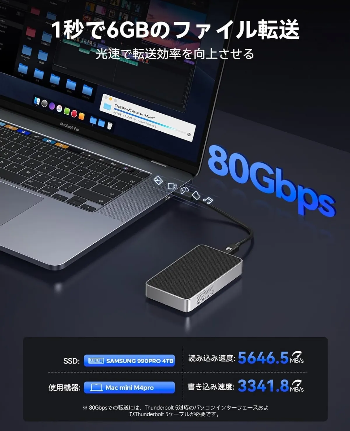 Thunderbolt 5規格をサポートしており、理論上最大80Gbpsの転送速度を実現します。これにより、4Kや8Kのビデオ編集、数テラバイトのファイル移動も一瞬で終わります。