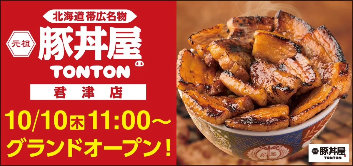 千葉県君津市に、北海道・帯広の伝統的な豚丼を提供する「元祖豚丼屋TONTON 君津店」が2024年10月10日(木)にオープンします。