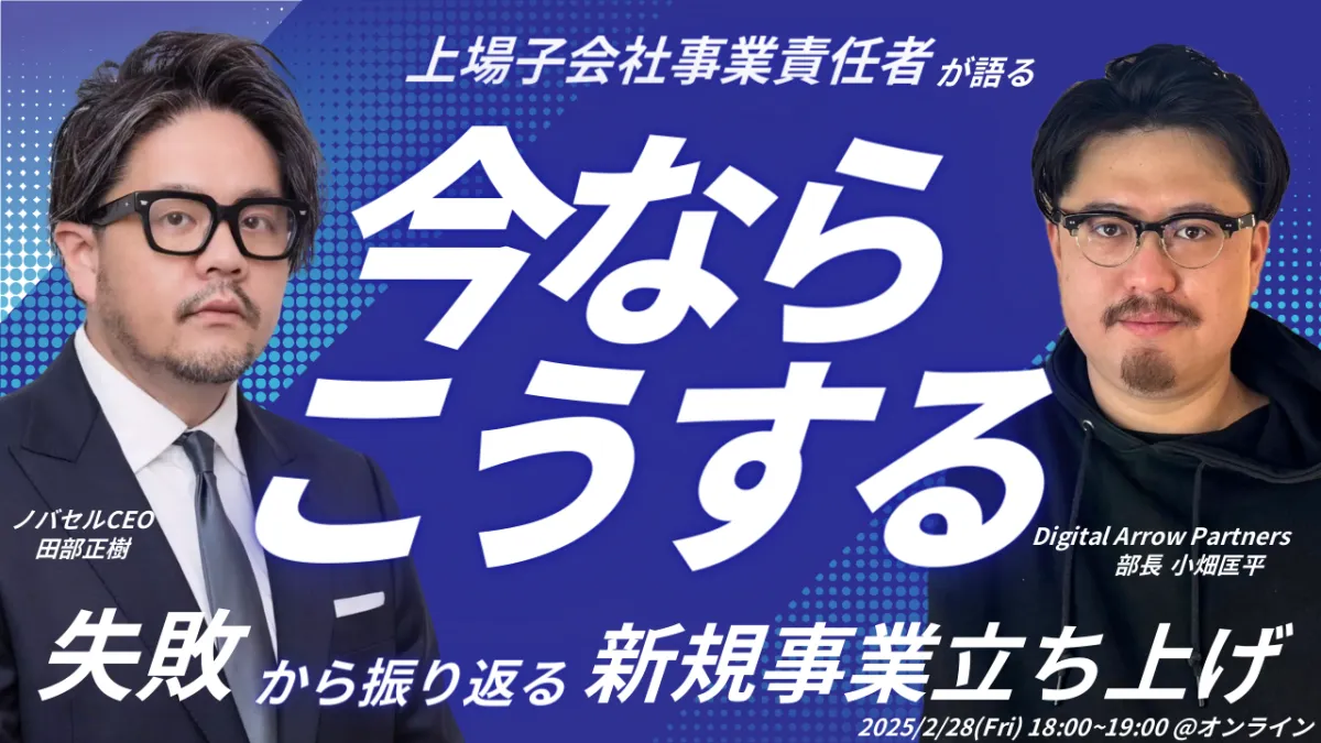 2025年2月28日(金)18:00から、株式会社TWOSTONE&Sonsの100%子会社であるDigital Arrow Partnersと、ラクスルグループのノバセルが共催するウェビナーが行われることになりました。このウェビナーは新規事業の立ち上げに取り組む企業にとって、成功の鍵を握る貴重な情報が得られる場となります。