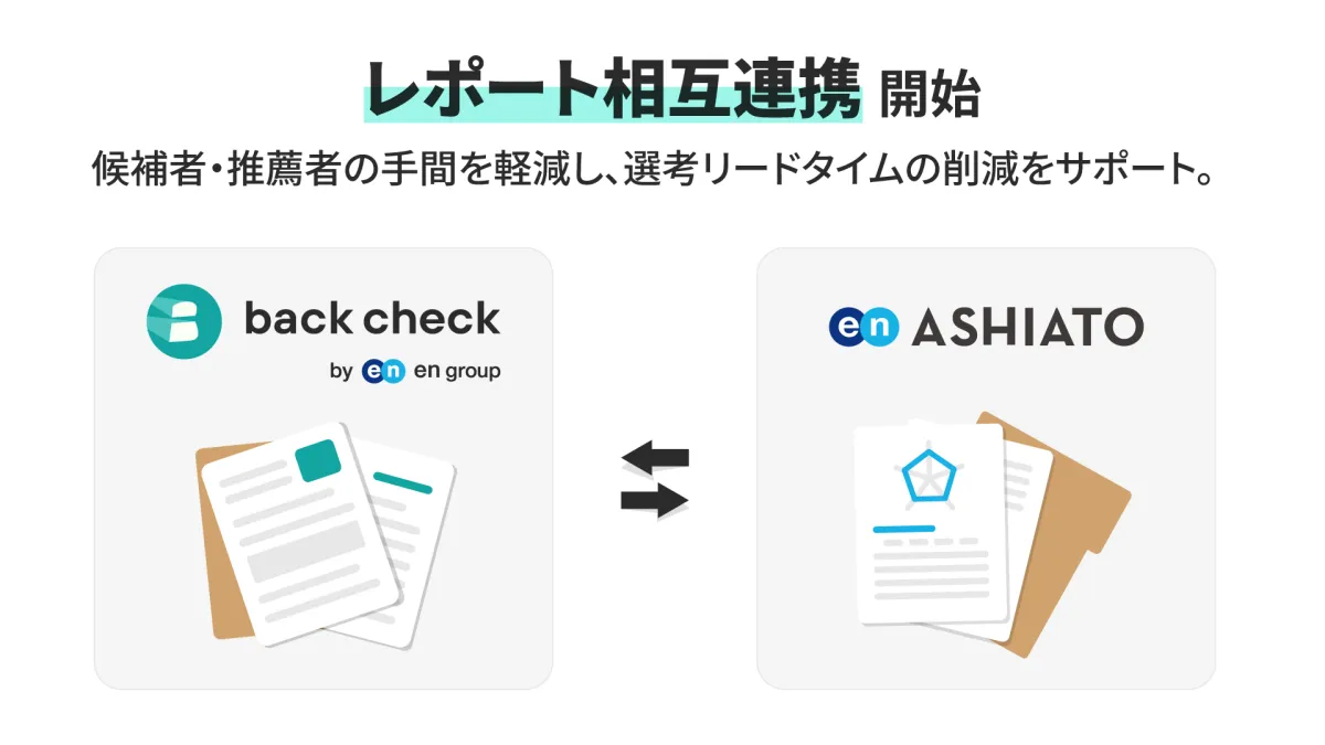 最近、back check株式会社が提供するオンラインリファレンスチェックサービス『back check』と『ASHIATO』の間で、リファレンスレポート相互連携の取り組みが始まりました。この施策により、候補者は過去に取得したリファレンスレポートを、採用企業の選考において自動的に利用できるようになります。