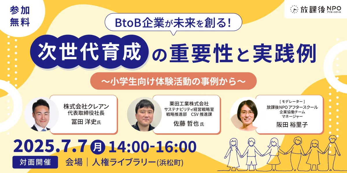 特定非営利活動法人 放課後NPOアフタースクールは、2025年7月7日(火)、東京都港区にある人権ライブラリーにて、「BtoB企業が未来を創る!次世代育成の重要性と実践例 ~小学生向け体験活動の事例から~」というセミナーを開催します。このイベントの目的は、BtoB企業における次世代育成の役割と重要性を理解し、実践事例を交えて考えることです。