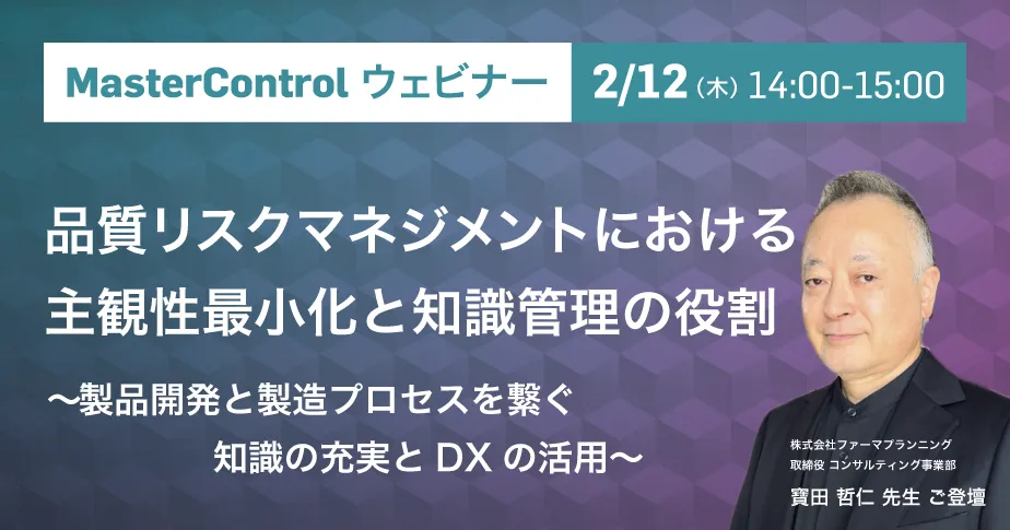 2026年2月12日、マスターコントロール株式会社が主催するウェビナーが開催されます。テーマは「品質リスクマネジメントにおける主観性最小化と知識管理の役割」。このセミナーでは、医薬品製造における最新のリスクマネジメント戦略やデジタル技術の活用について、第一線の専門家が解説します。