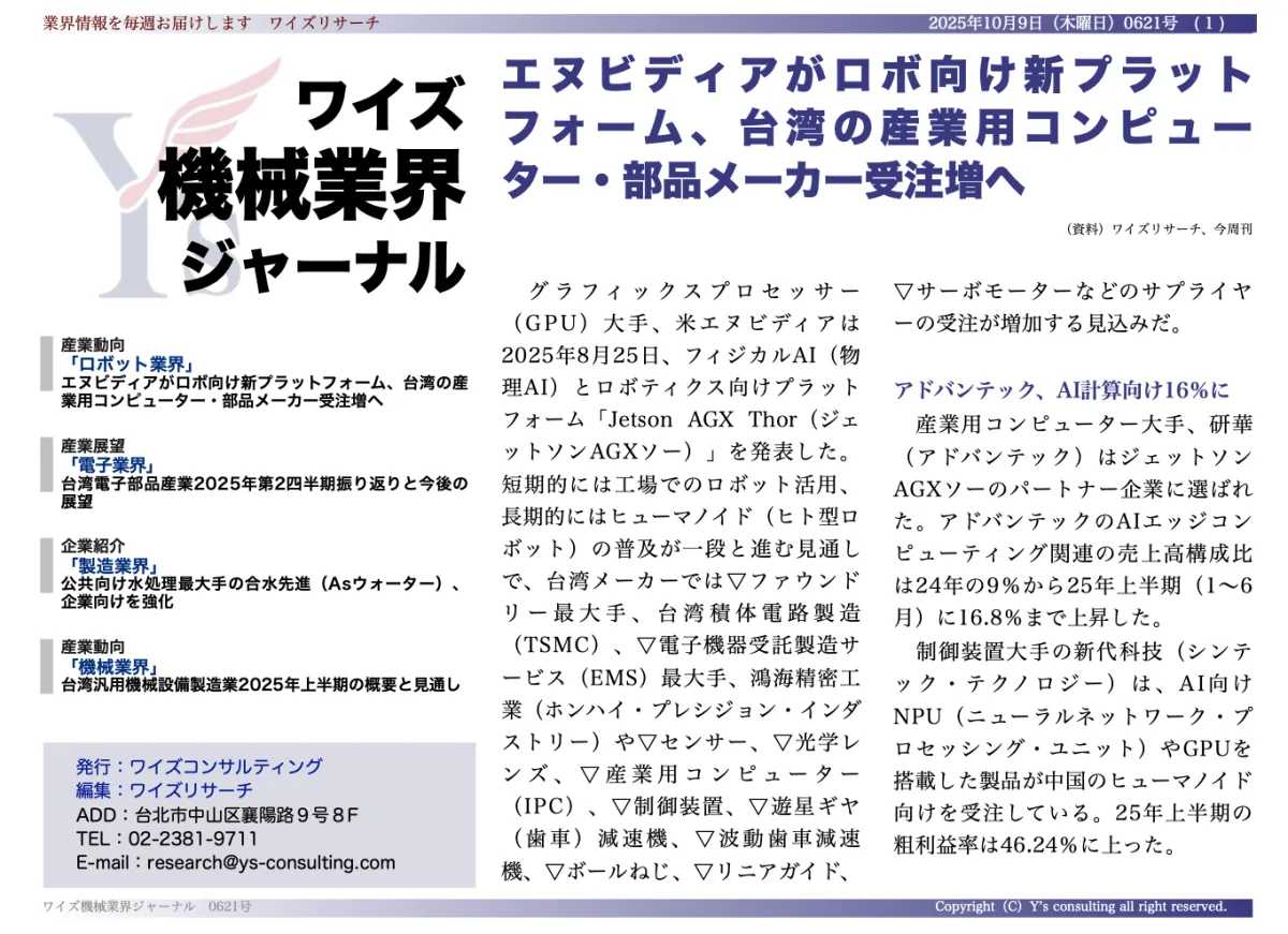 台湾の製造業は、変化の波に乗り、業界の進化が求められています。最近、米エヌビディアが新しいロボット向けプラットフォーム「Jetson AGX Thor」を発表しました。このプラットフォームは、フィジカルAI(物理AI)とロボティクスの対象であり、特にヒューマノイドロボットの普及を見据えています。これにより、台湾の主要な製造業者、TSMCや鴻海(ホンハイ)、アドバンテック、新代科技、上銀科技(ハイウィン)などが、さらなる受注の増加が期待されるという見通しが立っています。