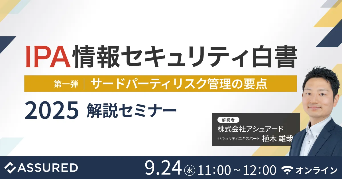 このたび、株式会社アシュアードが主催する解説セミナーが9月24日にZoomで開催されます。セミナーのテーマは「情報セキュリティ白書2025 解説セミナー第一弾:サードパーティリスク管理の要点」。本セミナーでは、サードパーティリスクに焦点を当て、企業がいかにこのリスクを管理し、社会全体のセキュリティ向上に貢献できるかを深掘りしていきます。