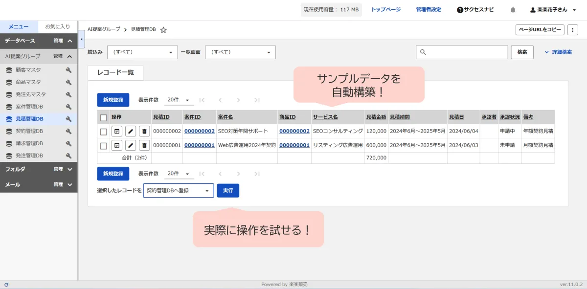 自動処理設定・サンプルデータの自動生成: 従来のアシストAIはデータベース構成案の自動生成に専念していましたが、新たに業務フローに基づいた自動処理設定やシステムの操作を模擬できるサンプルデータの自動生成が可能になります。