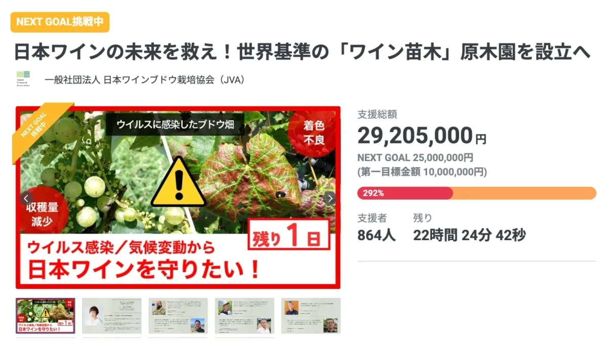 このプロジェクトは私たちJVAだけのものではありません。ワインを愛するすべての人々が共に支え合って、日本ワインの未来を築いていくチャレンジです。この数日間の支援も、未来に向けた重要な投資につながります。一人ひとりの支援が、次代のブドウ栽培と日本ワインの土壌を豊かにしていきます。