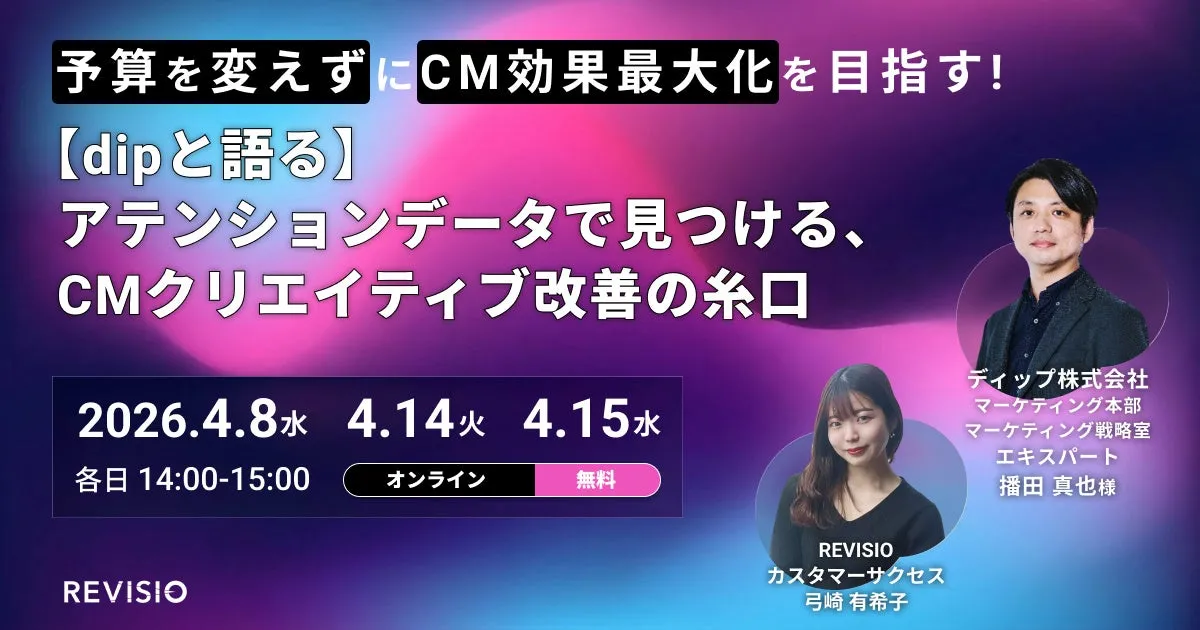 2026年4月、REVISIO株式会社が主催する無料ウェビナー『予算を変えずにCM効果最大化を目指す!【dipと語る】アテンションデータで見つける、CMクリエイティブ改善の糸口』が開催されます。このイベントでは、広告主や広告会社が直面する課題、「限られた予算内でのCMのインパクト向上」をテーマに、視聴者の注目を集めるための最新のアプローチを探ります。