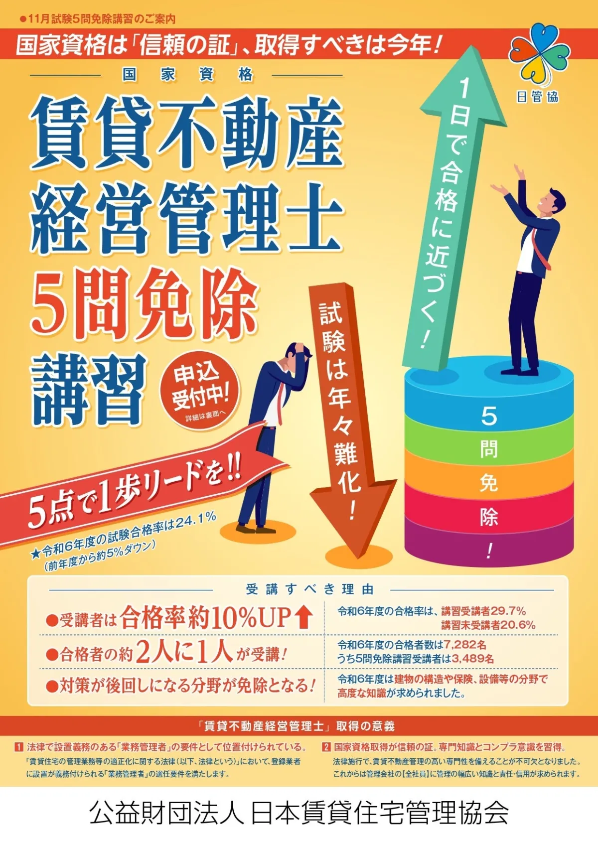 公益財団法人日本賃貸住宅管理協会は、令和7年度賃貸不動産経営管理士試験に向けた「賃貸不動産経営管理士5問免除講習」の受講申込みを、2024年4月24日から受け付けます。この講習を受けることで、受講者には本試験の50問中5問が免除される特典があります。
