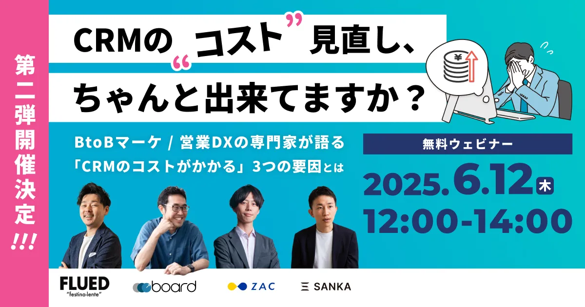 株式会社FLUEDは、BtoBマーケティングや営業DXの支援を専門に行っています。最近、BtoB企業ではCRMツールの導入が増えていますが、導入後に「コストが高い」「十分に使いこなせない」といった声も少なくありません。そこでFLUEDでは、こうした問題に対する解決策を模索するため、2025年の6月12日にウェビナーを実施します。このセミナーでは、CRMコストの見直しポイントや、コストを抑えつつ機能を実装する方法を詳しく解説いたします。