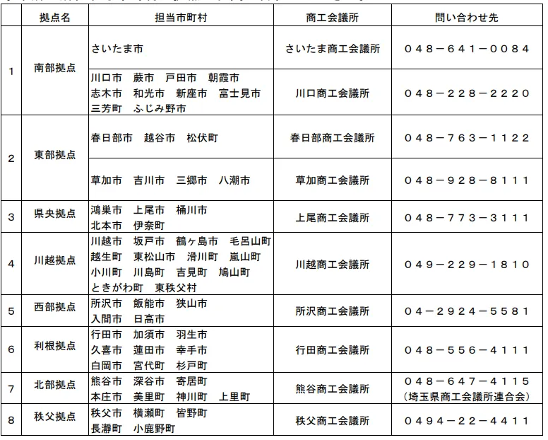 事業所が所在する市町村の拠点にて、詳細な支援内容や相談方法についてのお問い合わせが可能です。また、埼玉県の産業労働部の産業労働政策課商工団体担当に対しても、電話やメール(E-mail: