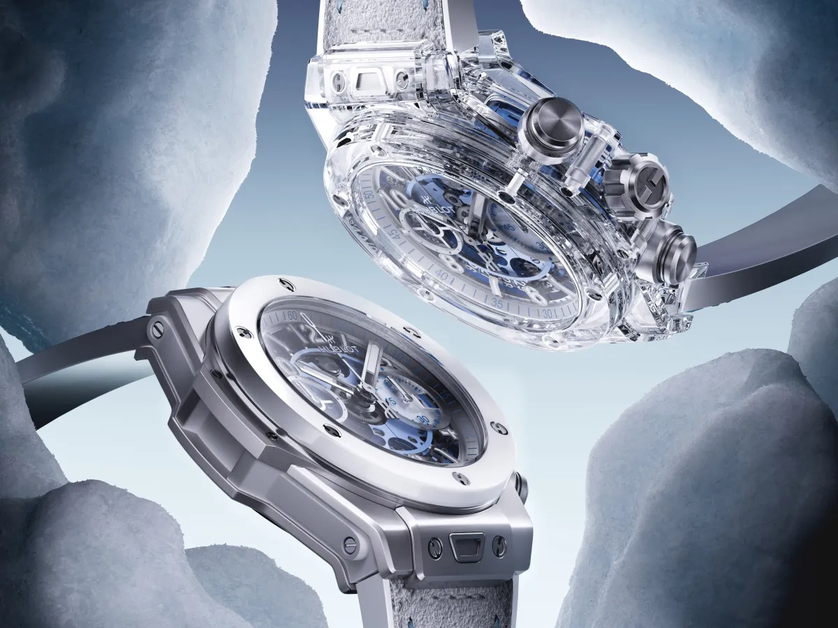 これらの時計は、サファイアクリスタルまたはチタニウムとセラミックで構成されており、氷のような白色と氷河の青色をテーマにした新デザインが際立っています。特に「ビッグ・バン ウニコ ウィンター サファイア」は、優れた耐傷性と高い透明度を誇り、見た目にも美しい仕上がりです。一方で、「ビッグ・バン ウニコ ウィンター チタニウム セラミック」は、軽量なチタニウム製のケースとホワイトセラミック製のベゼルが特徴で、機能性とデザイン性を兼ね備えています。両モデルともに直径42mmのケースを持ち、ウブロの特許技術である「ワンクリック」システムを搭載し、使い勝手の良さも実現しています。