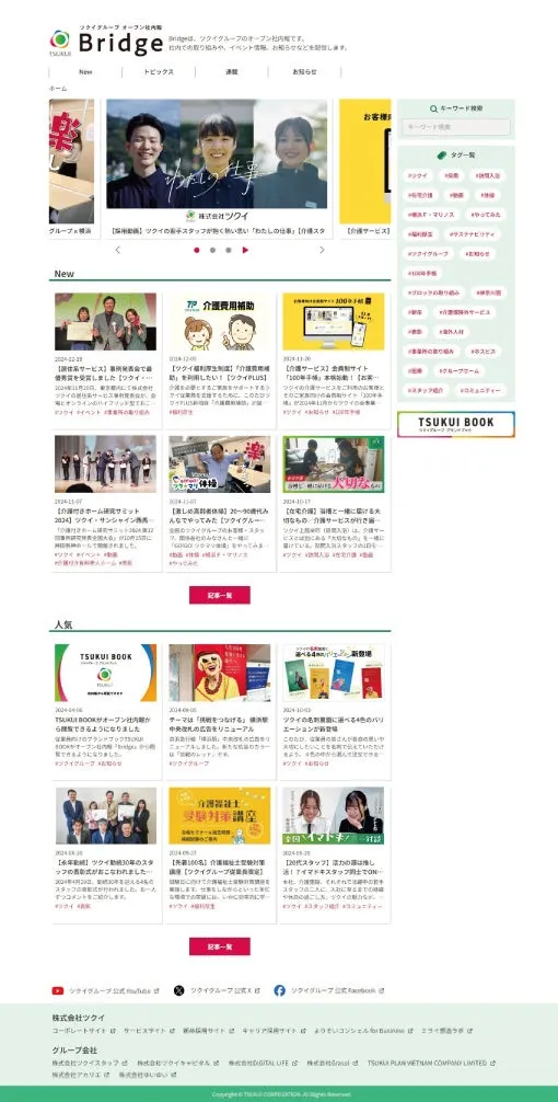 オープン社内報「Bridge」は、ツクイグループの全従業員の活躍や取り組みをリアルタイムで伝え、情報を効率的に共有することを目的としたツールです。このサイトでは、一部を除いて誰でもアクセス可能で、社内の重要な情報が簡単に得られるようになっています。