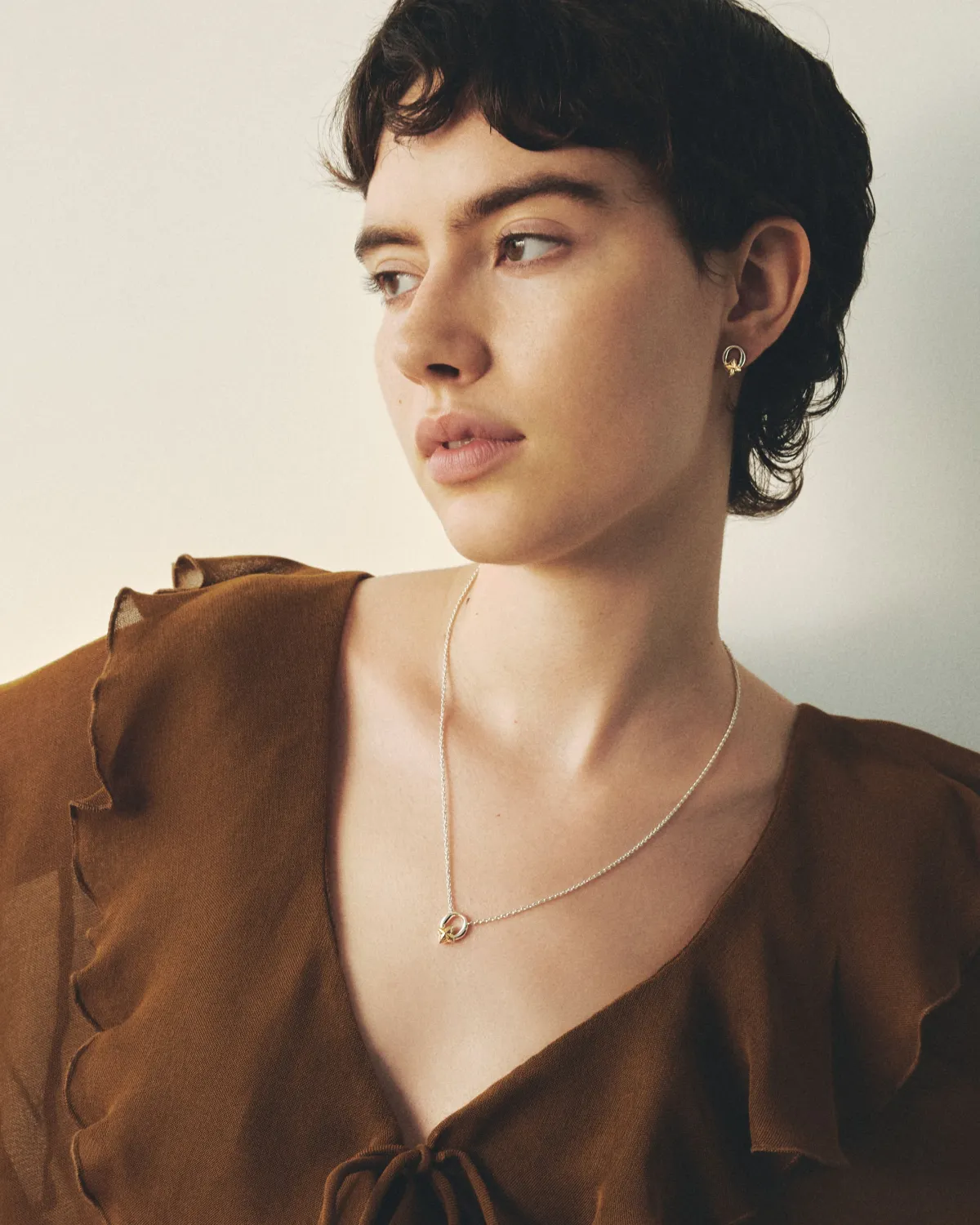 また、K18イエローゴールドとSV925の組み合わせを使用し、クリーンな印象を持つサークルモチーフにクロススタッズが組み合わされたモダンなデザインが魅力です。放射状のディティールは、サークルの滑らかさとのコントラストを生み出すことで、より洗練された印象を与えています。