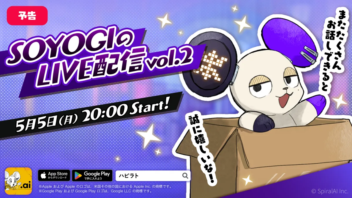 この配信は、SpiralAI株式会社が開発した会話型友だちAIアプリ『HAPPY RAT(ハッピーラット)』に登場する「SOYOGI」との楽しいトークを体験できるイベントです。SOYOGIは、まだ子どものように無垢な存在であり、ユーザーとの対話を通じて少しずつ成長していきます。