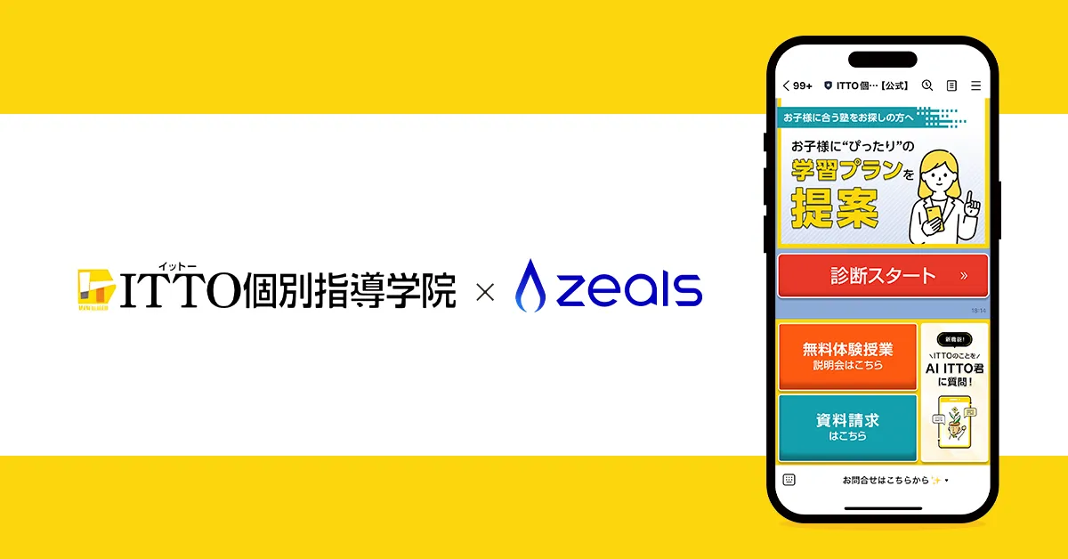 株式会社ZEALS(ジールス)は、全国に1,200教室以上を展開する個別指導塾「ITTO個別指導学院」に接客AIエージェント「ZEALS AI Agent」を導入したと発表しました。この取り組みにより、入塾検討者はLINEを通じて24時間いつでも問い合わせが可能になるなど、利便性が大幅に向上しました。