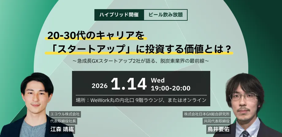 東京都千代田区で、エコウル株式会社と株式会社日本GX総研が共同開催するトークイベントが2026年1月14日に行われます。このイベントは「20-30代のキャリアを『スタートアップ』に投資する価値とは? 〜急成長GXスタートアップ2社が語る、脱炭素業界の最前線〜」というタイトルの下、GX(グリーントランスフォーメーション)領域でのキャリア形成に焦点を当てています。