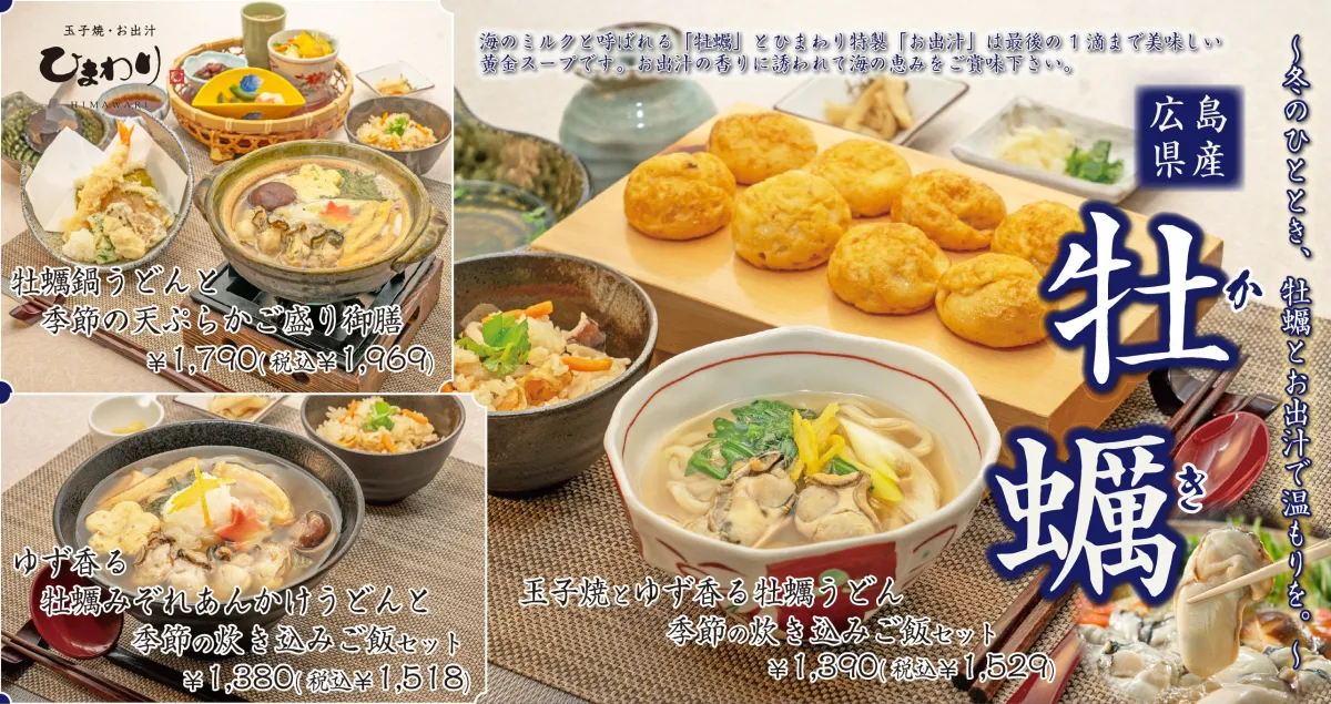 皆さんは、旨みたっぷりの広島県産牡蠣を存分に堪能できる「広島県産牡蠣フェア」を心待ちにしていることでしょう。このフェアでは、名物の玉子焼とともに「ゆず香る牡蠣うどん」や「牡蠣鍋うどん」、さらには冬の人気メニュー「牡蠣みぞれあんかけうどん」が味わえます。味だけでなく、見た目にもお楽しみがあり、季節ならではの食材を使った炊き込みご飯とのセットメニューも豪華です。