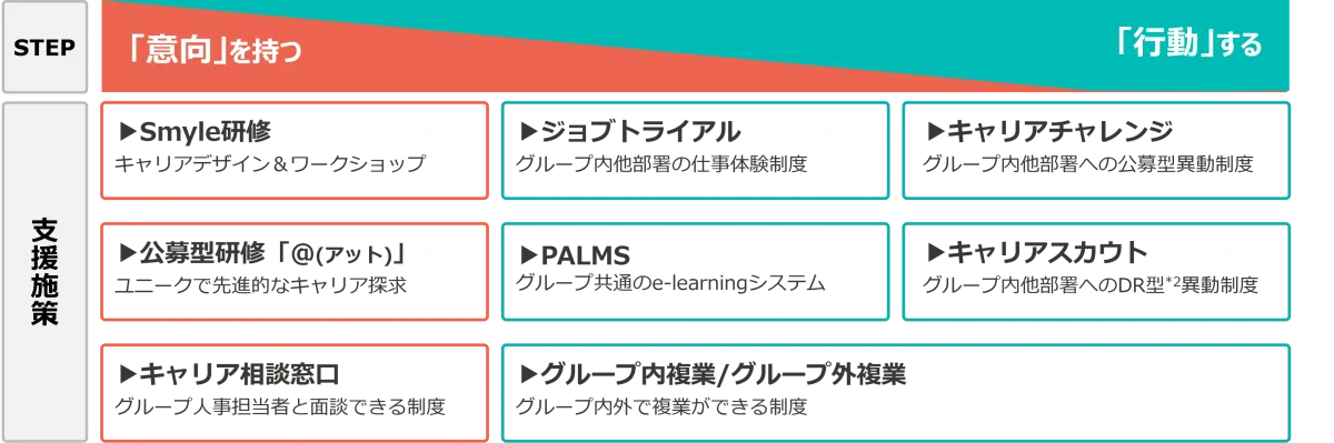 パーソルは、さまざまな施策を通じて社員のキャリアオーナーシップを強化しています。具体的施策は以下の通りです: