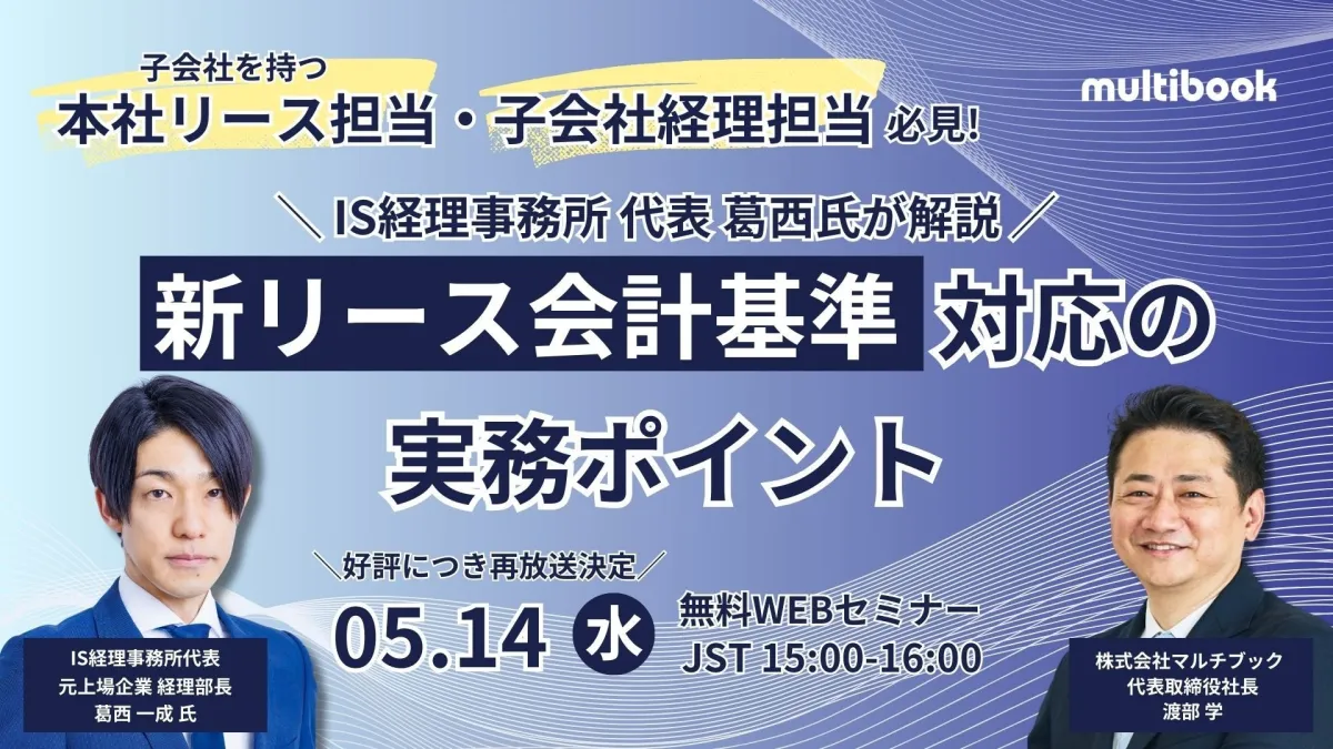 株式会社マルチブックは、国際的に事業を展開する企業の経営管理を支援するために、クラウド型ERPサービス「multibook」を提供しています。そして、IS経理事務所との共同で行ったウェブセミナー「親会社の決算担当者・子会社の経理担当者必見!新リース会計基準対応の実務ポイント」に対する好評を受け、再放送することが決定しました。