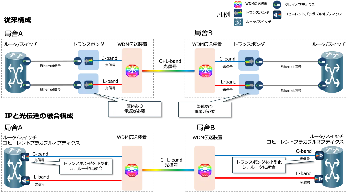 NTT西日本は、これまでのCバンドやLバンドの利用に加え、C+Lバンドの活用を進めることで、約2倍の伝送容量を確保できる手法を採用しました。さらに、コヒーレントプラガブルオプティクス技術の導入により、機器の小型化や導入コストの低減を図りつつ、省電力かつ省スペースでの運用が実現可能となります。