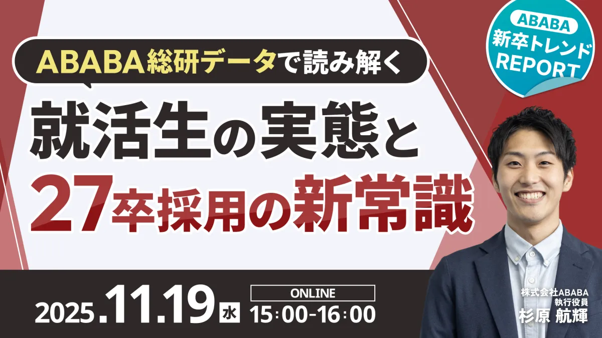 就職活動は年々変化しており、2027年卒の学生にとって内定を得ることは単なる通過点に過ぎない状況が浮き彫りになっています。このような背景を踏まえて、株式会社ABABA(東京都渋谷区)は、11月19日(水)に新卒採用担当者向けのオンラインセミナーを開催します。このセミナーは参加無料で、学生の就活実態を知る絶好の機会です。