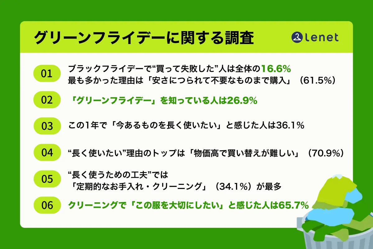 調査では「グリーンフライデー」という言葉の認知率が26.9%にとどまっている一方で、「必要なものを長く使いたい」と感じる人は36.1%に達しています。このことから、消費者の意識には変化の兆しが見えていることがわかります。