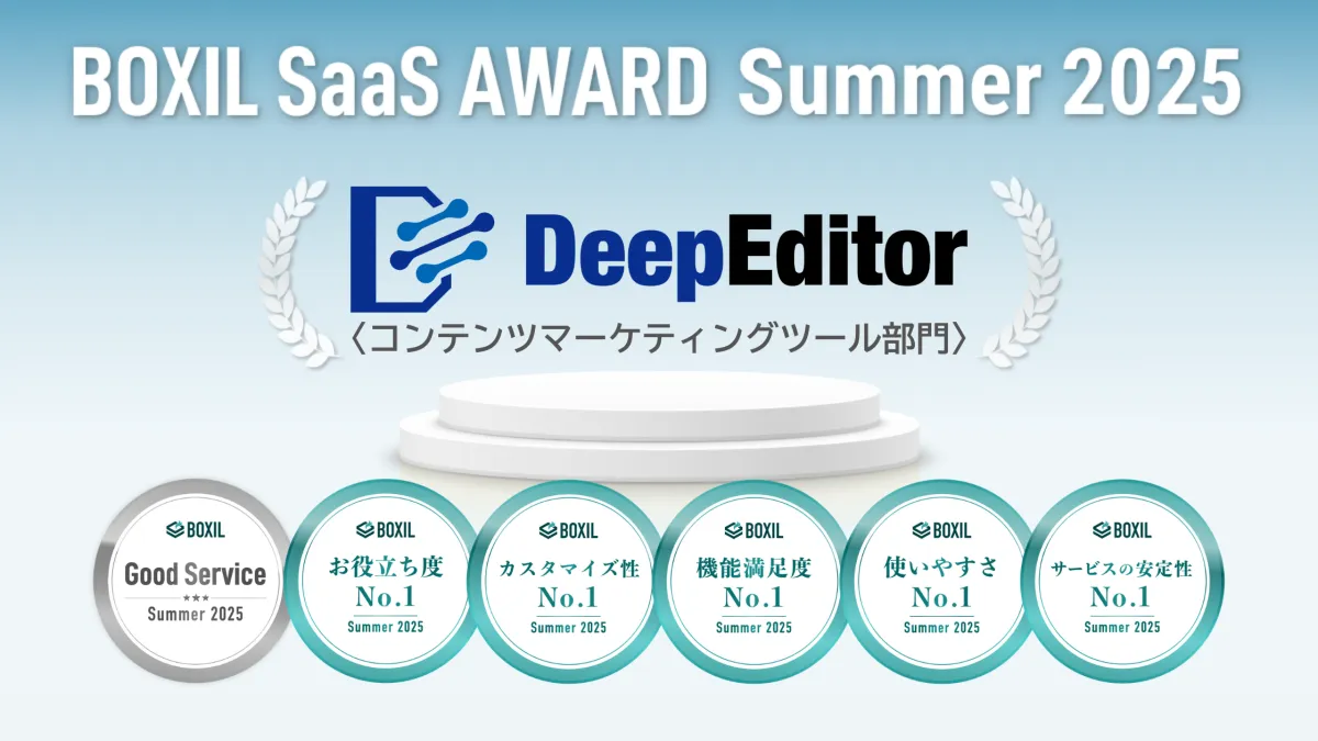 株式会社ipeが提供するAIライティングツール「DeepEditor」が、スマートキャンプ株式会社主催の「BOXIL SaaS AWARD Summer 2025」において、圧倒的な評価を受けて5つの部門でNo.1に選出されました。