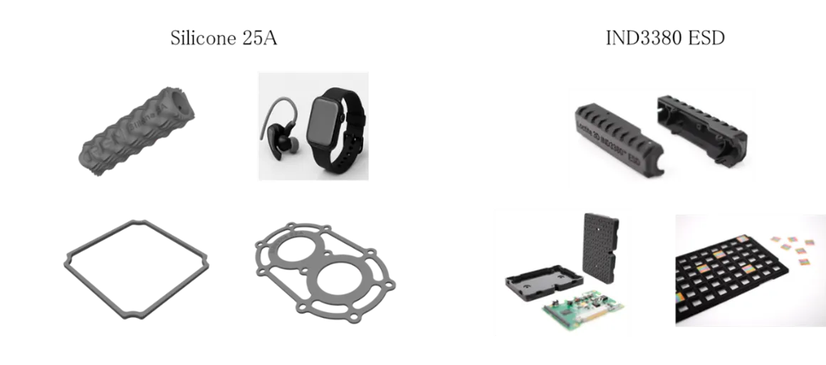 まず、Silicone 25Aですが、Originプラットフォームにおいて初めて利用可能な専用国産シリコーン材料となります。この材料は、ショア硬度が25Aに設定されており、引裂き強度は16kN/m、破断伸びは驚異の672%を実現しています。また、耐熱性も150℃の評価をクリアし、生態適合性や難燃性といったさまざまな認証を受けています。このような特性から、幅広い産業にマッチする製品を生み出す可能性を秘めています。特に医療機器や自動車部品など、要求される性能が厳しい分野での活躍が期待されます。