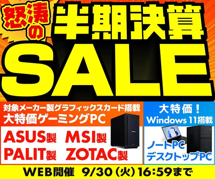パソコン工房のWEBサイトで、対象メーカー製のグラフィックスカードを搭載したゲーミングPCが対象の『怒涛の半期決算SALE』が好評開催中です。このセールは、2025年9月30日(火)16時59分まで続き、ユーザーにとってのお得な商品が多数ラインナップされています。