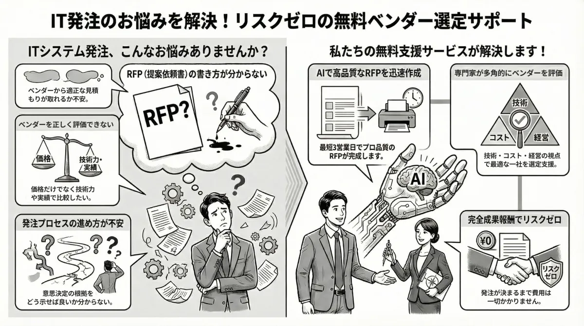 今日、多くの企業はITシステム発注において「RFP作成のノウハウ不足」「技術的評価軸の欠如」「ベンダー選定プロセスの不透明性」という3つの主要な課題に直面しています。特に、経験の浅い担当者にとっては、要件を適切に伝え、最適な見積もりを取得することが難しいというのが実情です。こうした悩みを解決し、企業のデジタルトランスフォーメーション(DX)を加速させるために、この新サービスは設計されました。