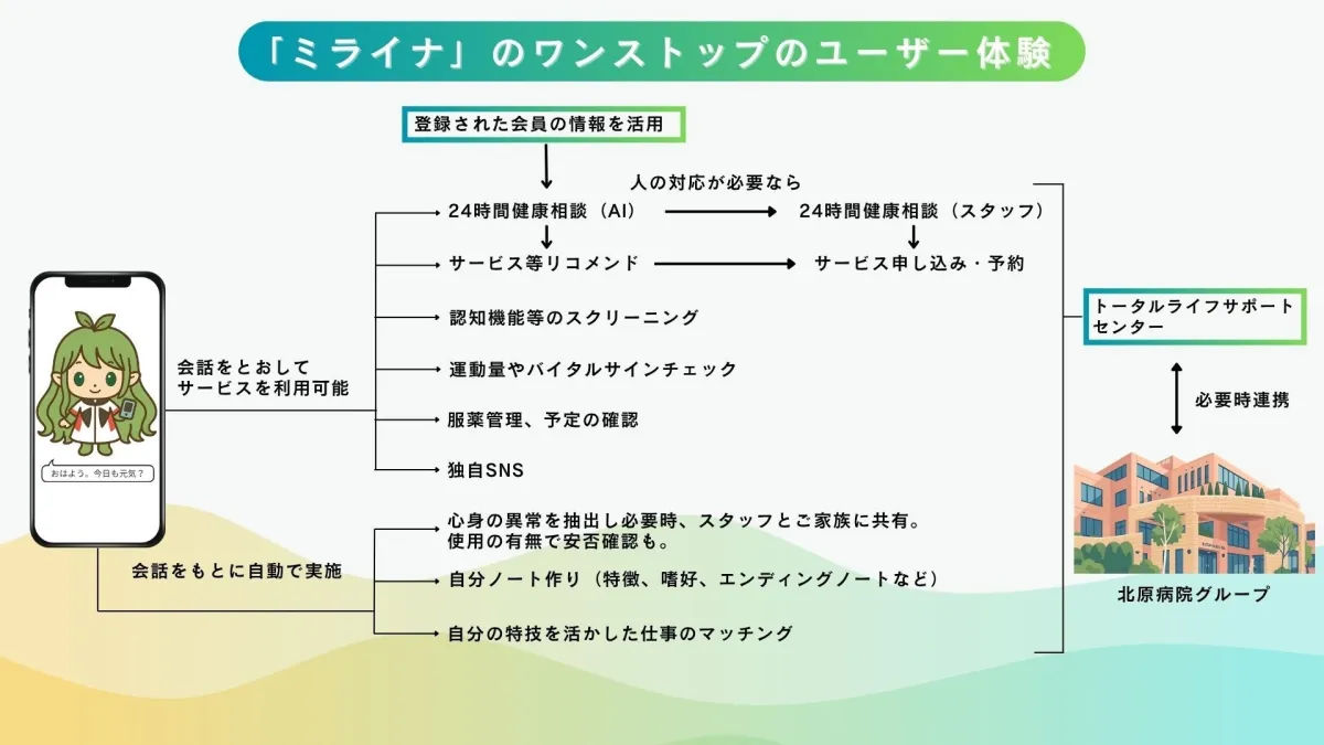 北原グループが運営する医療法人社団KNIと、kanata株式会社が連携したこのプロジェクトの背景には、少子高齢化が進む現代社会における医療資源の不足という大きな課題があります。「ミライナ」は、AIを用いたお手軽な健康相談を基に、実際の医療や生活支援へとシームレスに繋げることを目的としています。相談の内容は北原グループに所属する医師や看護師、リハビリ職などが実際にフォローするため、専門的なサポートが受けられるのが最大の特徴です。
