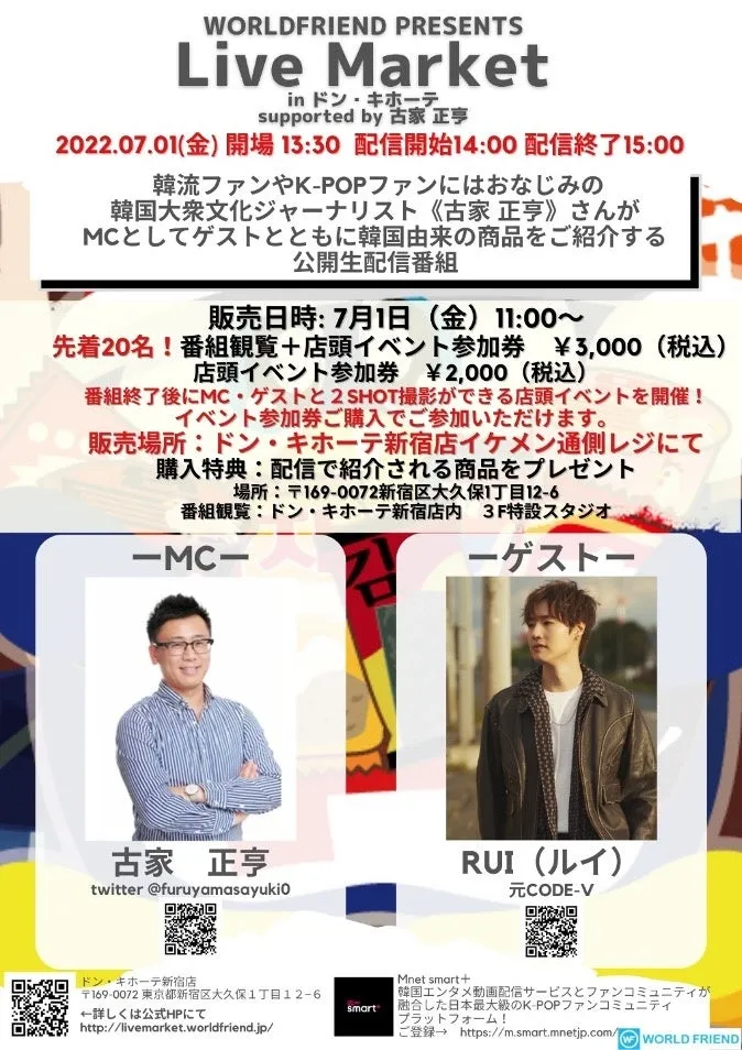 「WORLDFRIEND PRESENTS Live Market in ドン・キホーテsupported by 古家 正亨」は、韓国文化をテーマにしたイベントで、今回は、韓国大衆文化ジャーナリストの古家正亨さんと、元CODE-VのRUIが出演します。イベントでは、韓国の最新情報や商品を紹介するコーナーや、古家正亨さんとRUIによるトークコーナーなどが予定されています。