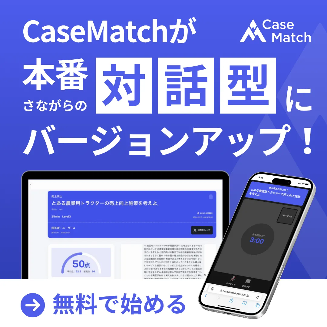 CaseMatchは、対話型のAIを利用して実践的なケース面接を行うことができるプラットフォームです。音声を使用して直感的な形で練習できるため、これからケース面接の準備を始める人やスキルを高めたい人の両方に適しています。実際のデータによれば、新卒の戦略コンサルタント内定者の約66%がこのプラットフォームを利用しています。