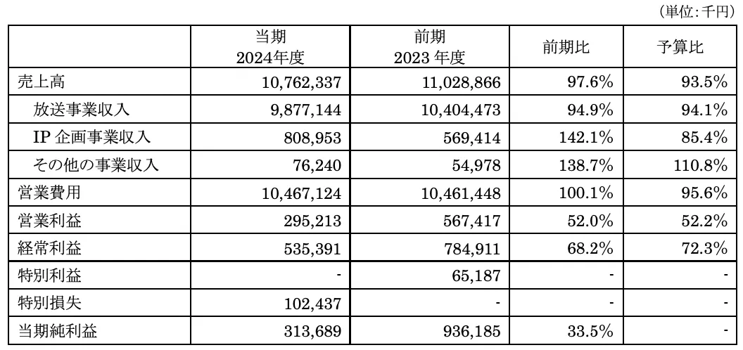 特別損失に関しては、AuDee事業からの撤退による減損損失や関係会社株式の評価損が影響し、全体の利益を圧迫しました。そして、2025年度の予算については、放送事業収入がさらに減少することが予測されています。その見通しは前年から約3%の減とし、タイム収入の落ち込みを含んでいますが、IP企画事業では38.8%の増収を見込んでいることは明るいニュースです。