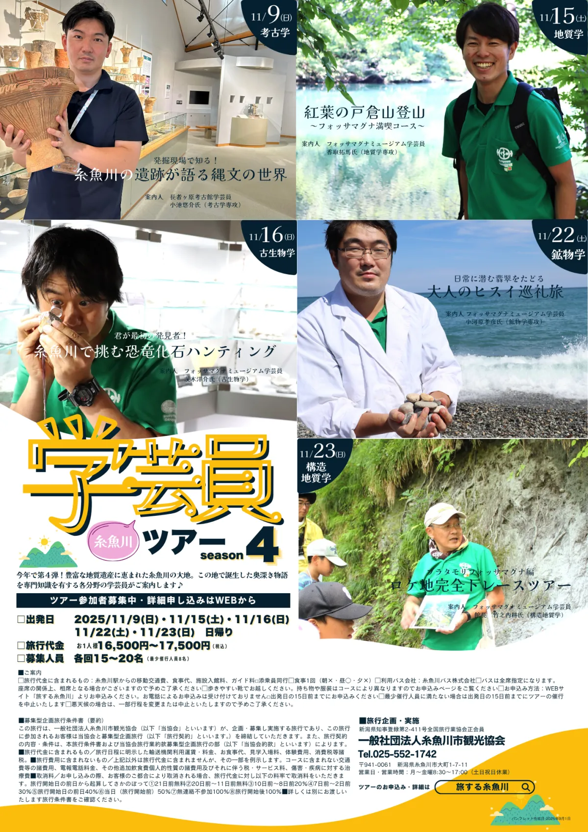 糸魚川市では、自然と歴史を深く学べる「学芸員ツアー」の第4弾を開催します。この特別なツアーは、地質や歴史に詳しい学芸員が案内し、参加者が五感で楽しめる体験を提供します。日程は2025年11月9日から11月23日まで。少人数制のグループなので、丁寧に学べる内容となっています。