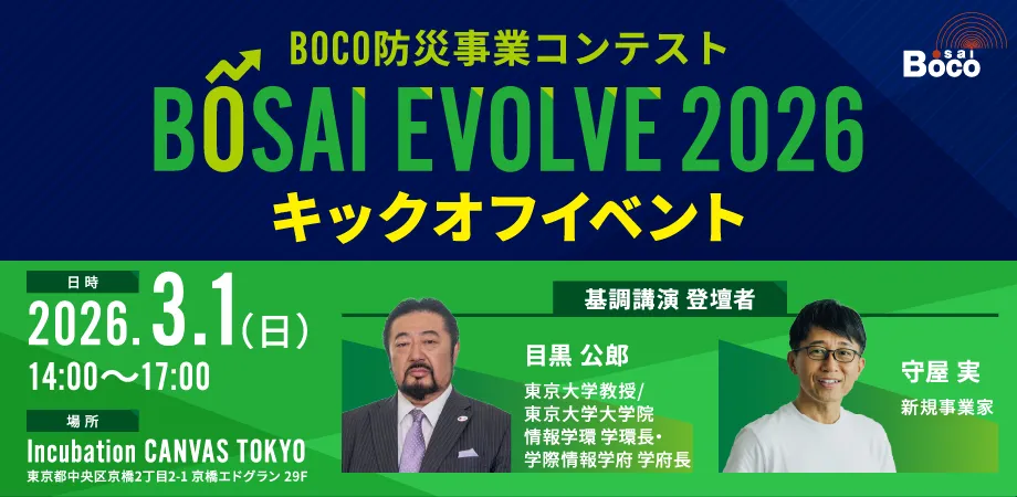一般社団法人防災事業経済協議会(BOCO)は、社会で実際に使われ、継続する防災事業を育てるためのコンテスト「BŌSAI EVOLVE 2026」を開催します。このコンテストは、日本が抱える防災の未解決課題と事業機会に挑むもので、スタートアップや新規事業チーム、研究者、自治体関係者などが参加対象です。特に注目すべきは、単に評価で終わらせないこと。BOCOは、専門家によるメンタリングやネットワークを通じて、事業が社会に根づくまでをしっかりとサポートします。