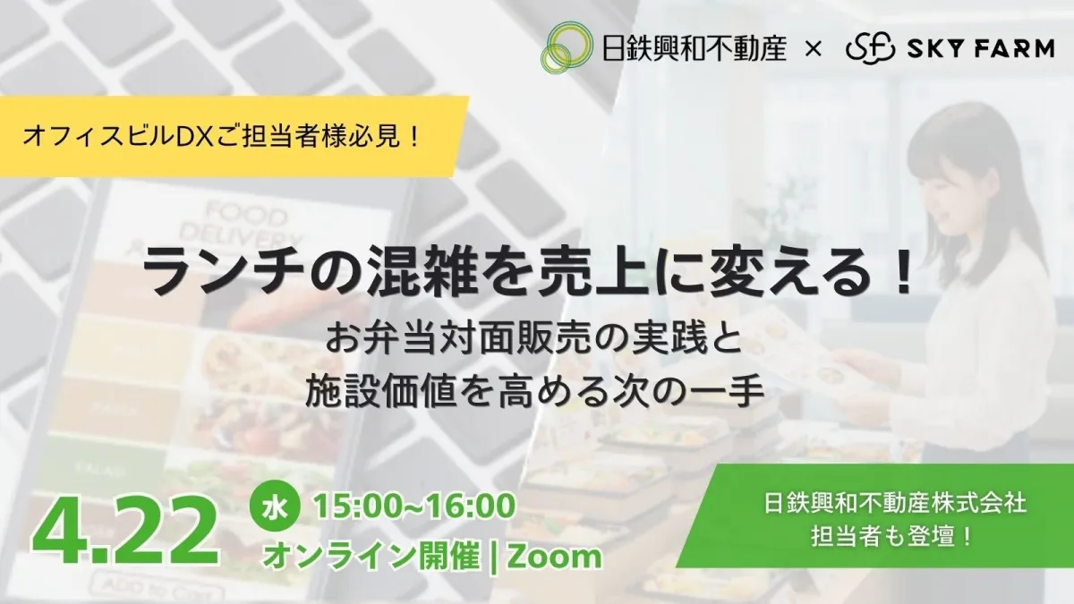 スカイファーム株式会社が主催するオンラインウェビナーが、2026年4月22日(水)15:00から開催されます。このウェビナーは、商業施設やオフィスビルの関係者向けに、ランチタイムの混雑を解消し、空きスペースを有効活用するための具体的な方法を紹介します。特に、お弁当販売の取り組みを通じて、収益向上を狙う戦略がテーマです。