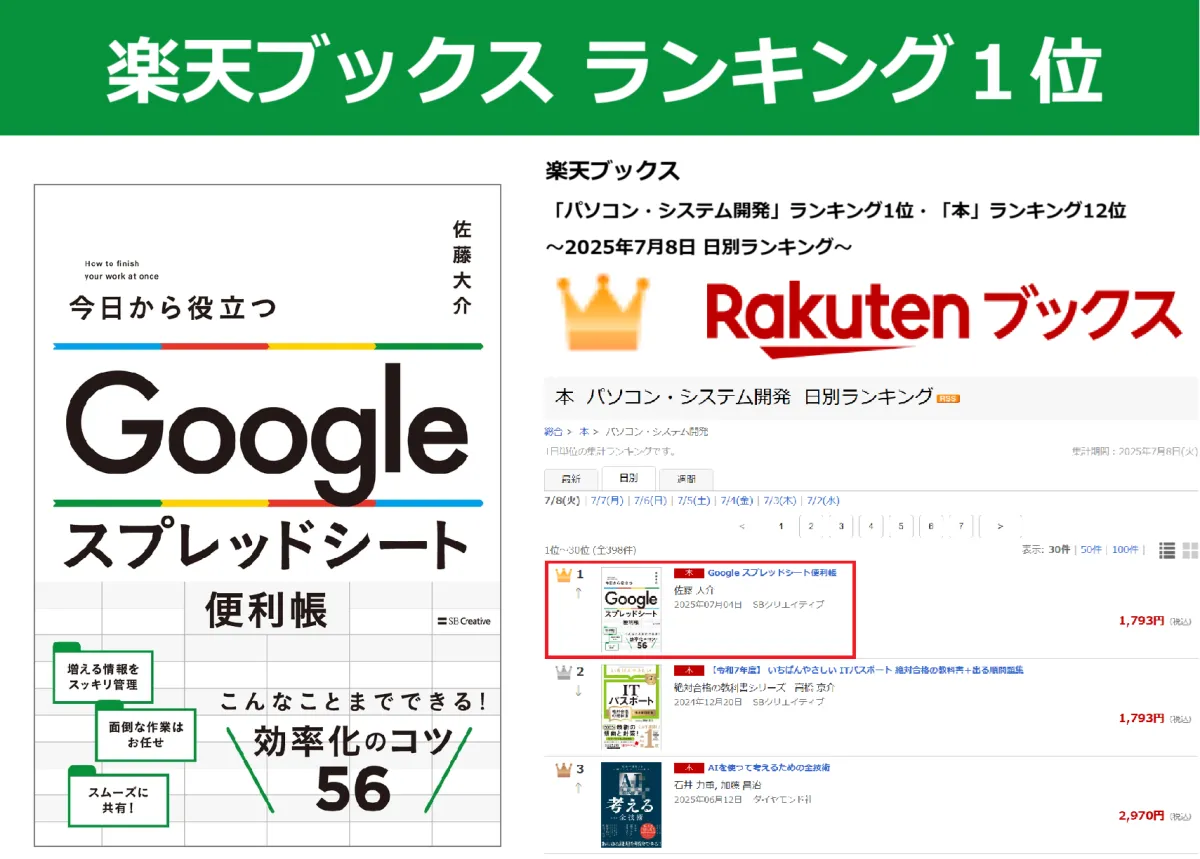 2025年7月4日、SBクリエイティブより佐藤大介氏が著書『今日から役立つ Google スプレッドシート便利帳』を出版。この書籍はリモートワーク時代における必携アイテムとして、すでに楽天ブックスのランキングで『パソコン・システム開発』部門1位に輝いています。さらに、Amazonレビューでは★4.9の好評価を得ており、初心者から上級者まで広く支持されています。