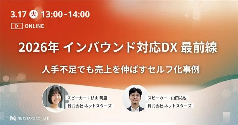 株式会社ネットスターズが2026年のインバウンド市場についてのウェビナー「2026年 インバウンド対応DX 最前線」を3月17日(火)の午後1時から開催します。このウェビナーでは、2025年に訪日外国人観光客数が過去最高を記録した背景をもとに、今後の業界の方向性や対応策を探ります。