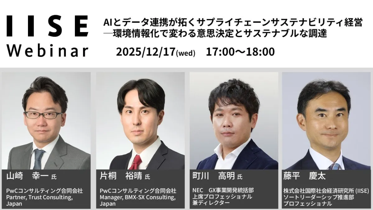 国際社会経済研究所(IISE)は、2025年12月17日(水)に「AIとデータ連携が拓くサプライチェーンサステナビリティ経営」をテーマとしたウェビナーを開催します。このイベントでは、企業が環境情報を駆使してどのように持続可能な経営を実現できるかを探る機会を提供します。